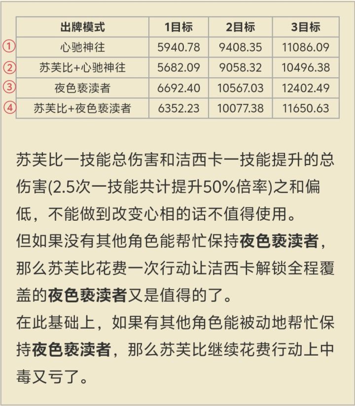 目前版本6触发〔夜色亵渎者〕并不稳定,而且需要行动次数。苏芙比稳定的多,还能让小鹿的一技能吃到多层中毒的额外倍率。所以①和④对比能视为苏芙比对小鹿的提升,提升非常大(这也是为什么以前我说小鹿刚需苏芙比)![[表情_猫咪举手]](https://img-tc.tapimg.com/market/images/a3c0b426c5410082eae426404982cc0e.png)