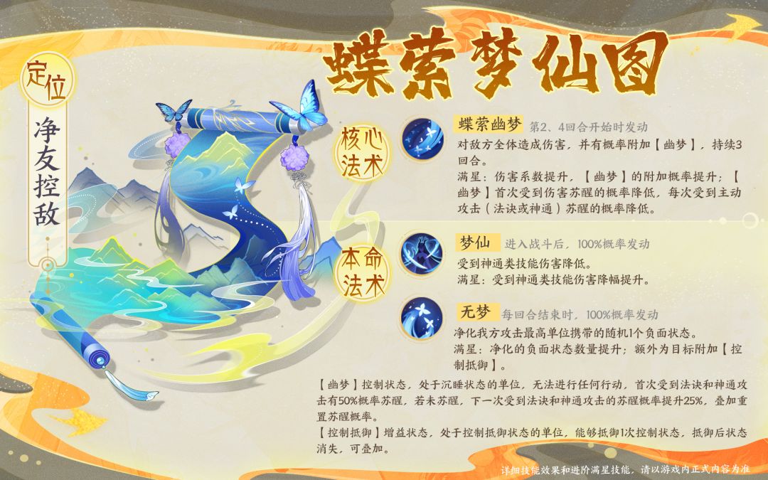 ●本命法术:对敌方全体造成百分比伤害,并有概率附加【幽梦】,持续3回合。伤害系数提升,【幽梦】首次受到伤害苏醒的概率降低至30%,每次受到主动攻击(法诀或神通)苏醒的概率提升降低至5%。