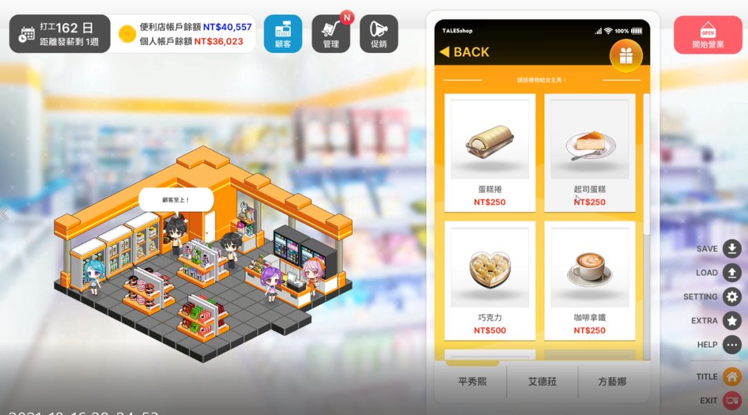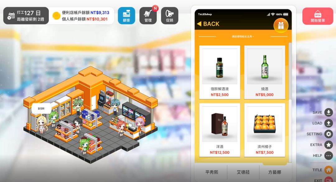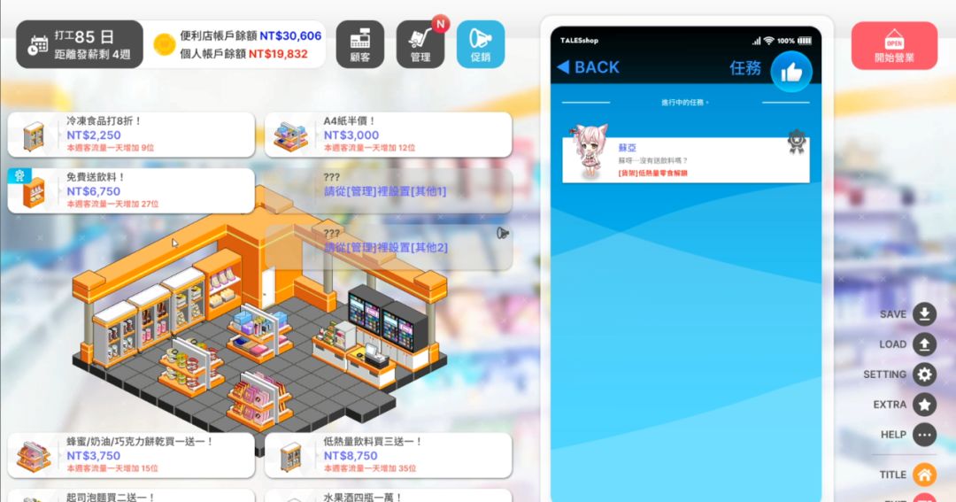 虽然表面上乍看是很简单的经营小游戏,但说穿了就是游戏内设置的一个 Deadline,玩家必须在这有限的时间提高营收,努力为自己加薪才有本钱推进主线以及送礼提升角色的好感度。