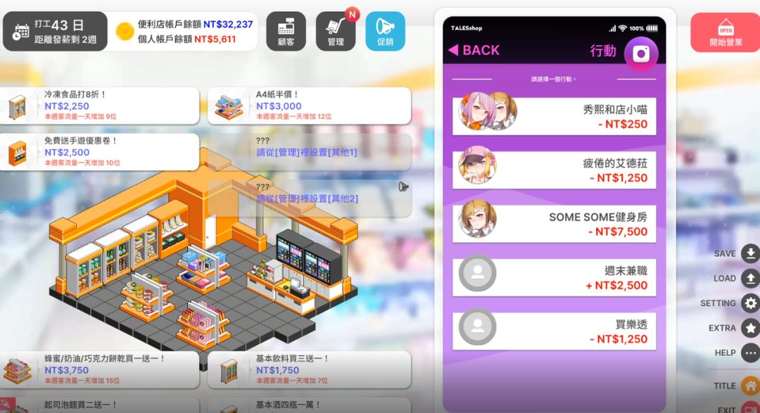 这时间内玩家要持续经营便利商店,透过购买新的商品以及活动促销来提高店里的营业额,当营业额提高玩家们的薪水就会随即提升,玩家才有更多的「行动权」约女主角出门,否则在没有薪水的情况下是无法推进故事剧情的。
