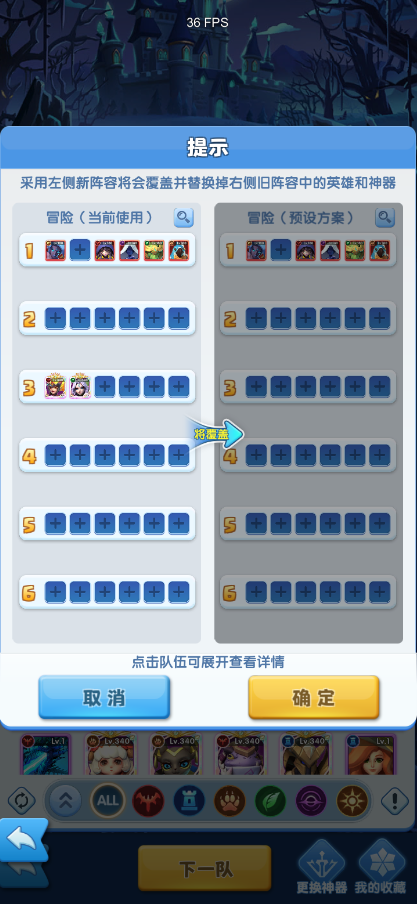 1、在【复制阵容】或【修改阵容】等,对当前预设方案产生修改时,会有二次确认弹窗提示