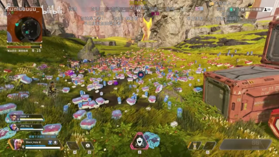 莱斯一路小跑,来到了最后一个安全区附近的草地。他打开背包,把刚才拿到的蓝色电池、红色血包都扔到草地上。随即,他又跑上一个旁边的斜坡,站在高处大喊:「大家都先进去圈,把药摆一下,不要堆起来摆,服务器容易炸掉!」