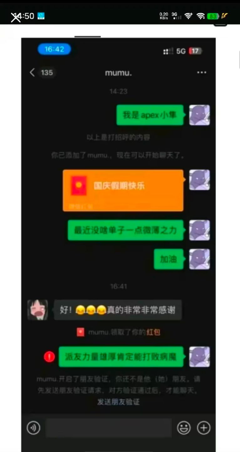 在对木木的怀疑逐渐加重的时候,网上又流传出一张截图:这是一段玩家和木木的微信聊天,这个玩家给木木发送捐款的红包后,木木表示感谢,但当他想要再说几句祝福的话时,发现自己无法发送消息。