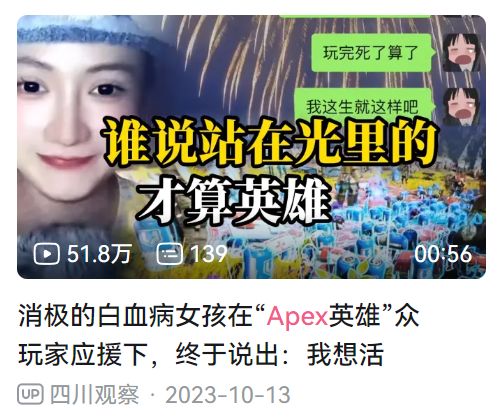 木木是一个《Apex英雄》玩家,这款游戏是大家认识木木的契机,所以它承载了更多的意义。「你不光是要成为Apex的捍卫者,生活里你也要成为捍卫者」,玩家们告诉木木,18赛季的名字恰好叫「复活」,是为她而起的,所以她一定要乐观,要保持坚强。