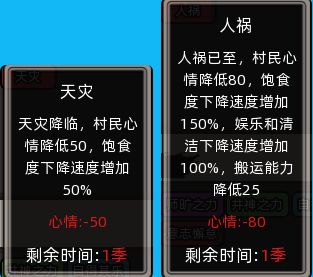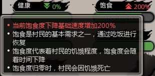 村民各项需求增加100%,工作能力降低50%, 制造建筑产出上限降低20%。