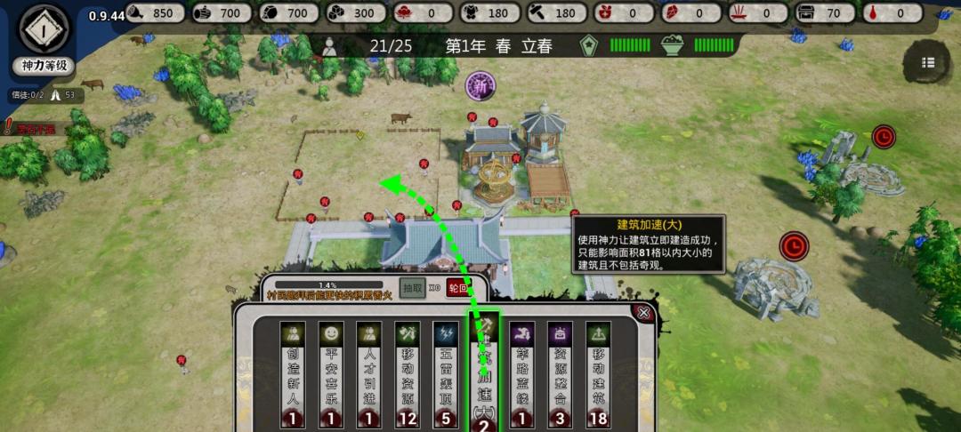 建筑 -> 神权 -> 神兽台 -> 放置到空地上 -> 打开神威使用建筑加速(大)。