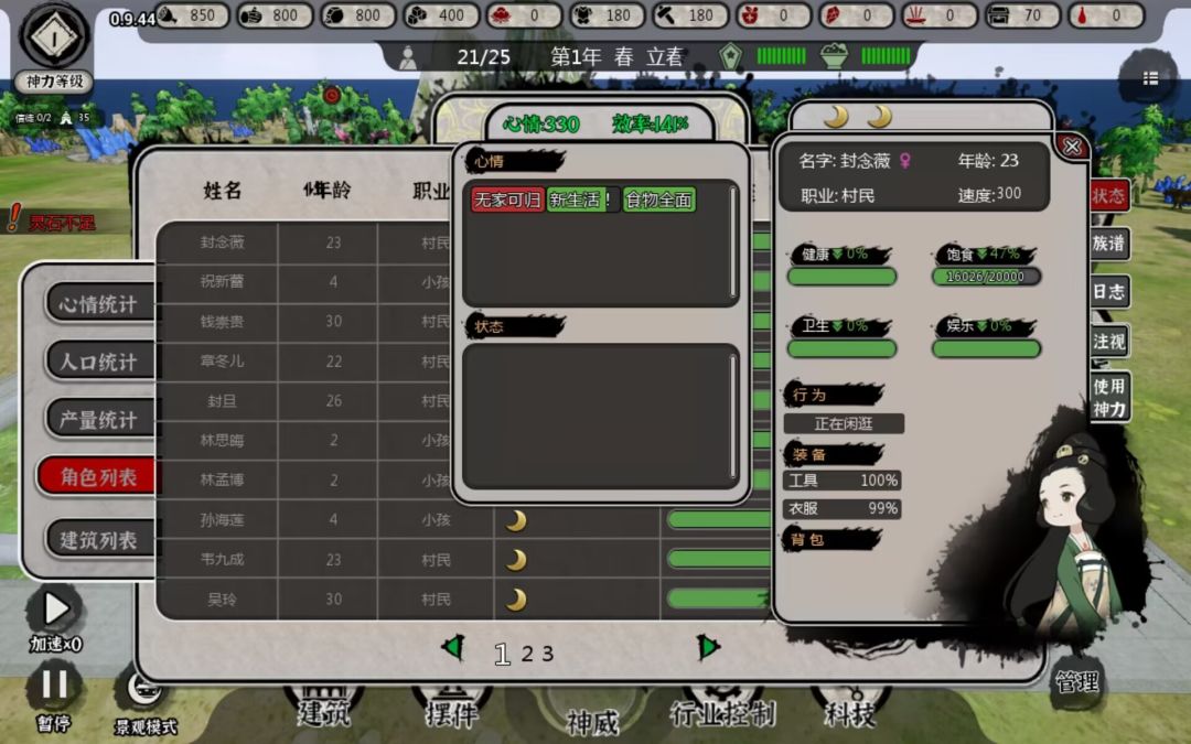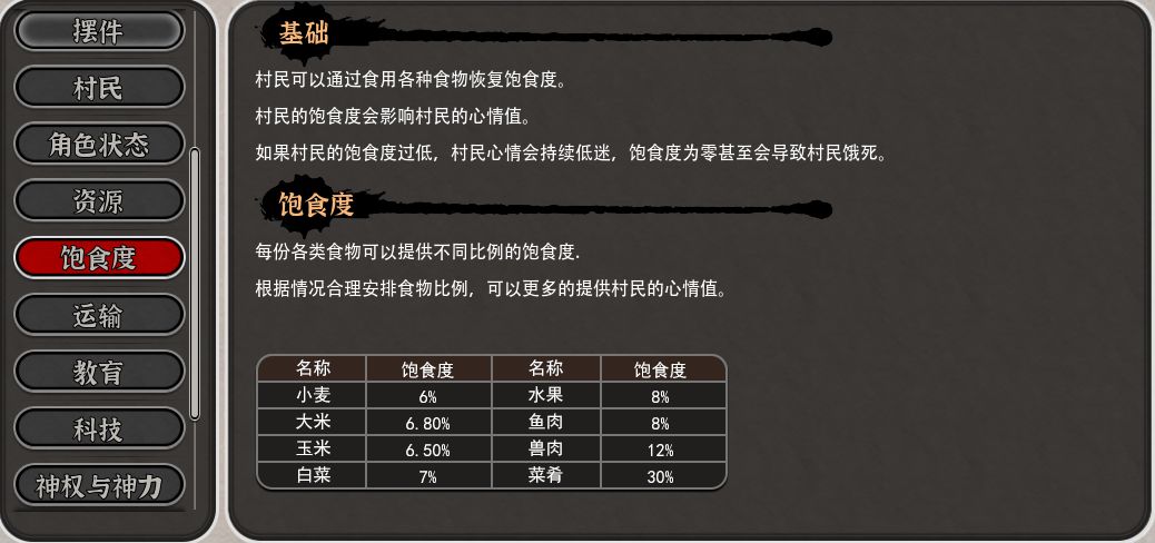 村民需求:饱食度,清洁度,娱乐值,健康值,默认是100%,根据难度不同变化,进入游戏后可以在小人面板看见。