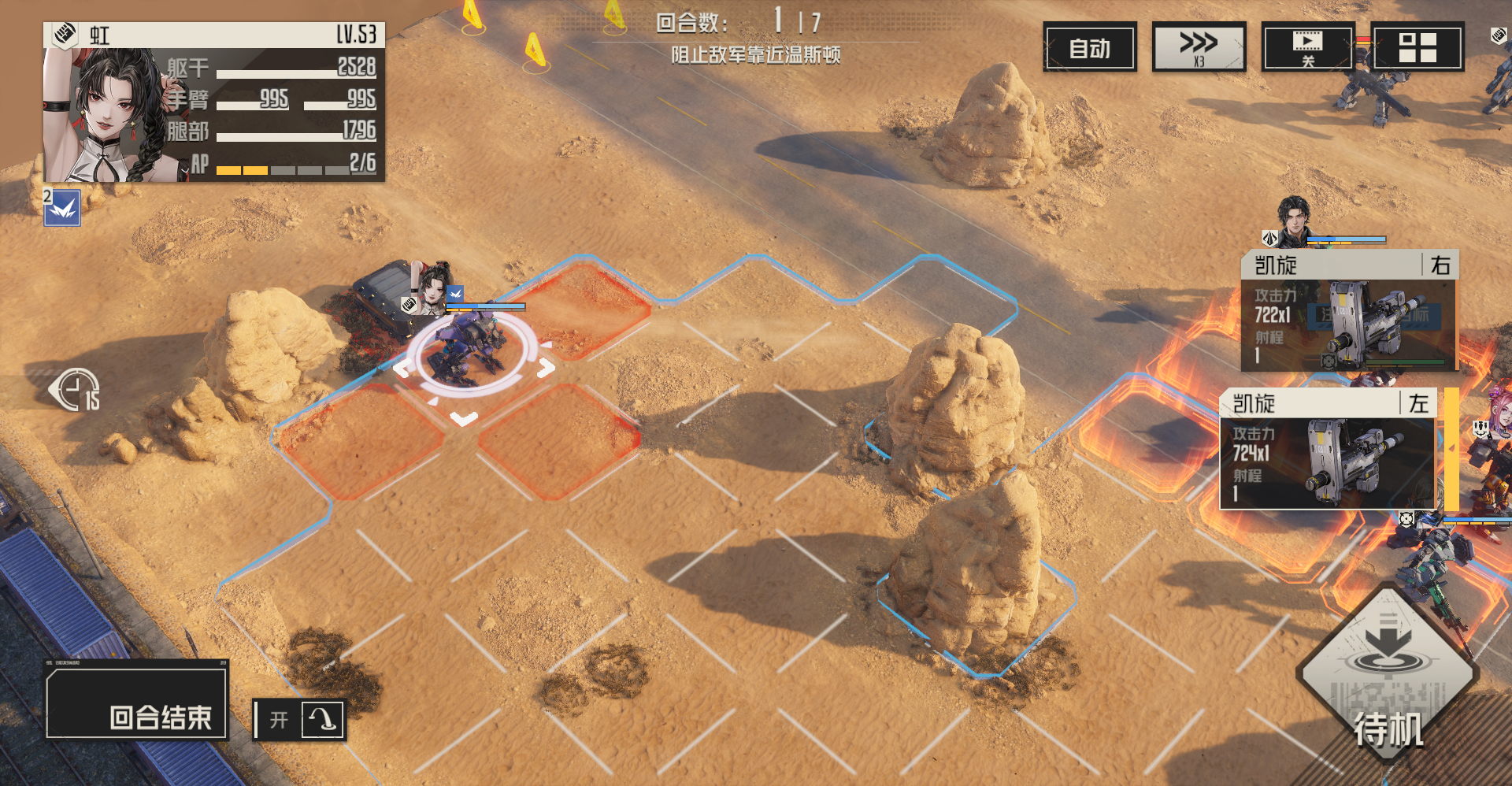 全身而退:敌人战术有火箭也有导弹,火箭第二回合不会攻击,所以第一回合我们要先将导弹消灭,火箭留在第二回合处理,避免被攻击到