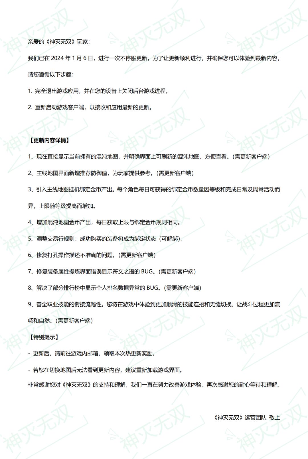 2024年1月6日不停服更新公告