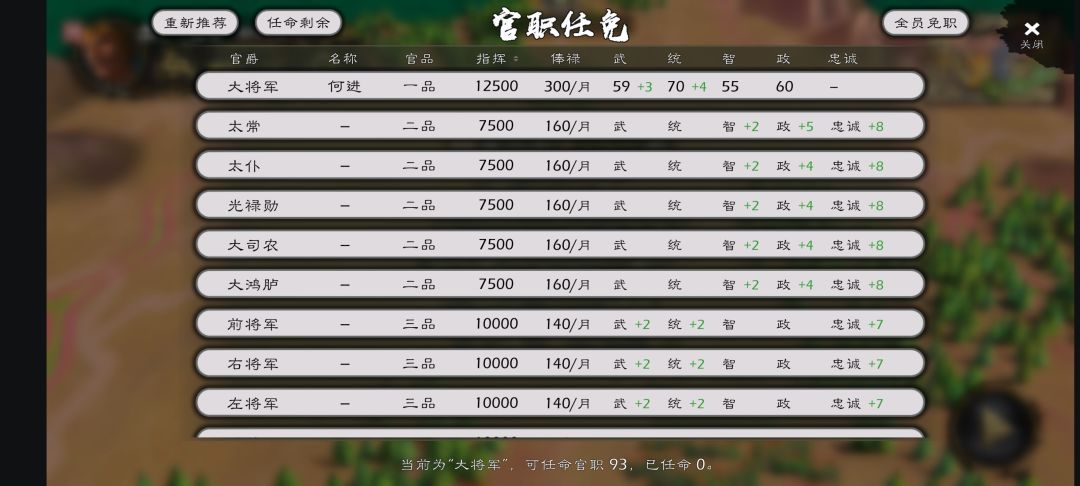 之所以选何进就是为了表现官职的重要性,这个剧本开局何进就是大将军,手下能任命一大堆将军,将军可以增加带兵数量,兵力越多计算的伤害减伤就越多,一万兵的邢道荣能追着五千兵的关羽打,而文官任命是为了增加你军师的智政让他追平96,这样可以减少科研时间,所以平时只给军师任命官职,打架给猛将将军官职