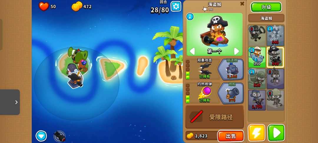 首先建议把自动开始关了,前期丢血不用怕,难度在前期过渡,一岛左侧留着给冰猴。开始一岛放法师猴,升1-0-2,升级后的攻击范围能打到气球就行,放潜艇猴,升2-0-0,放工程师猴,升0-3-2,洗洁精范围挨着攻击边缘,卖潜艇猴放先锋琼斯,再放海盗猴,升2-2-0,记得先升法师猴到1-0-3,再攒钱升海盗猴到2-4-0过第40波。后面就没发图了,我的步骤如下,放迫击炮猴,升0-2-3,攻击范围在洗洁精前面,升法师猴到1-0-4,放冰猴,升4-2-0,攒钱先升海盗猴到2-5-0,再升迫击炮猴到0-2-4,最后在二岛放超猴侠,升2-3-0,后面就可以随意发挥了,我是先放潜艇到超猴子下方,升3-0-0,再放海盗猴到超猴侠上方,升3-2-0完成挑战。