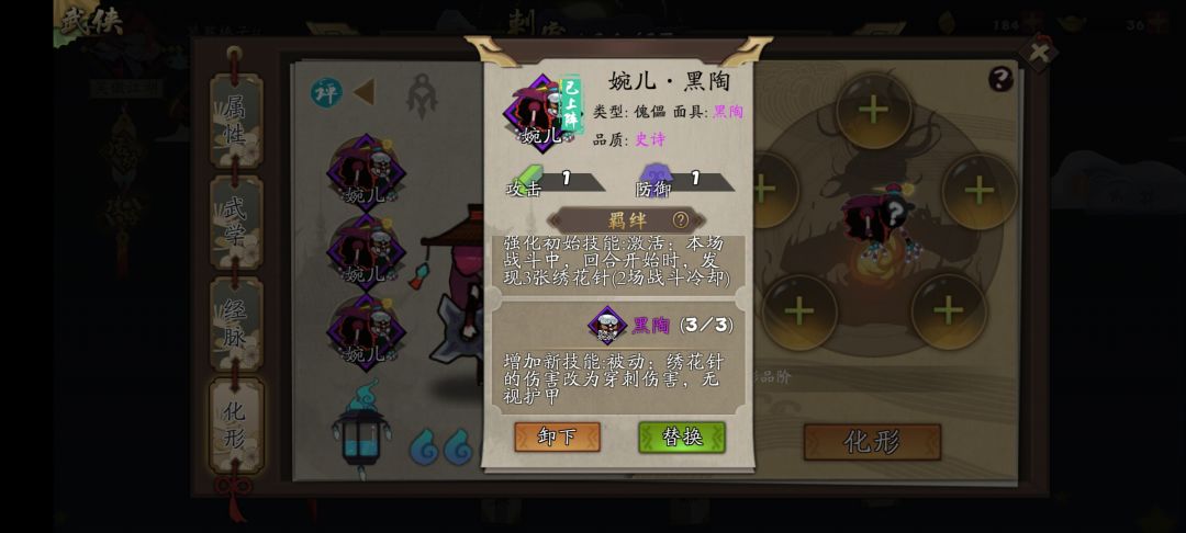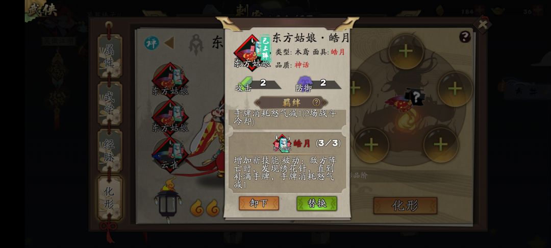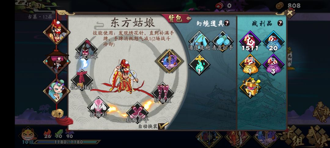 装备优先折梅,吸血(不考虑祭坛的话),忠武,紫金,这里说一下,前期优先折梅是因为,前期牌组不够精简,葵花的针不够的话,循环不起来。祭坛选择优先复制(复制一葵花,之后复制2&3针),次复活,之后是护甲没有吸血套可选吸血,其他可有可无,婉儿红化自带穿透。