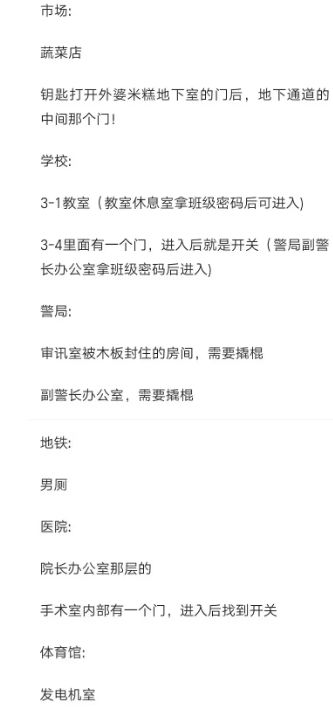 如果你想回到之前的地方如警局,学校,地铁站,市场等,你需要前往体育馆舞台那个场景,左数第二个屋子有鬼窟到市场,从市场到地铁站,地铁站的站台还有鬼窟,可以到医院的