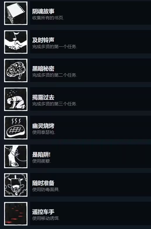 我想这5个成就不用多说,按照我之前的攻略进行,必定能取得!值得一提的是,拿圣水的那个不是指的从医院教堂拿圣水的那个步骤,而是破解门谜题后拿到的圣水!