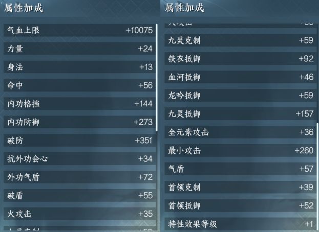 属性加成:破防351,命中56,力量24,身法13,火攻击35,全元素攻击36,最小攻击260,首领克制39,日月两仪灵韵。