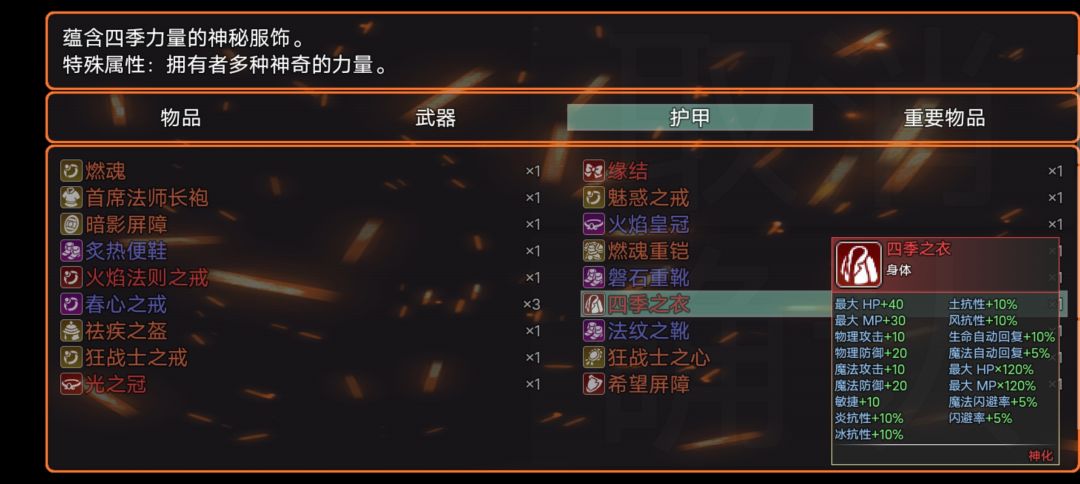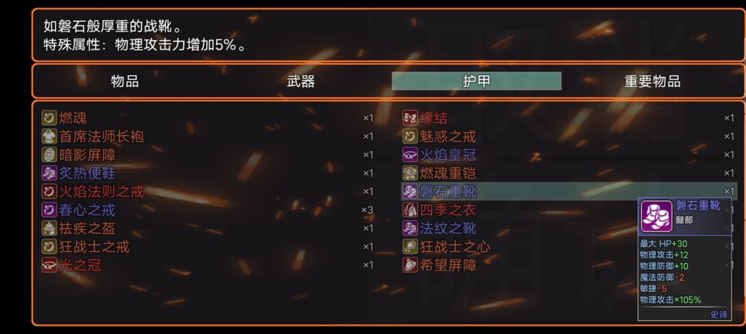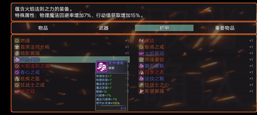 火焰领域:火焰皇冠、燃魂重铠、火焰法则之戒、炙热便鞋。