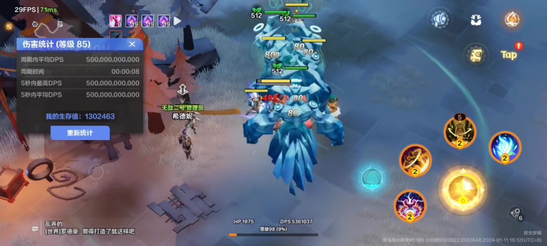 所以冰魔灵的极限伤害其实都能算出来,每只魔灵最多0.5秒一次的伤害,一次0.1兆,三只就是0.3兆。1秒就是0.6兆,再乘以个极限堆的对生命额外伤害。(对生命的额外伤不受直伤锁上限影响)0.6*2=1.2