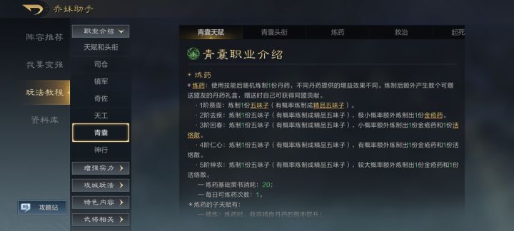 二阶青囊同样一天炼一次丹,和产出额外5个可以赠送盟友的丹药盒