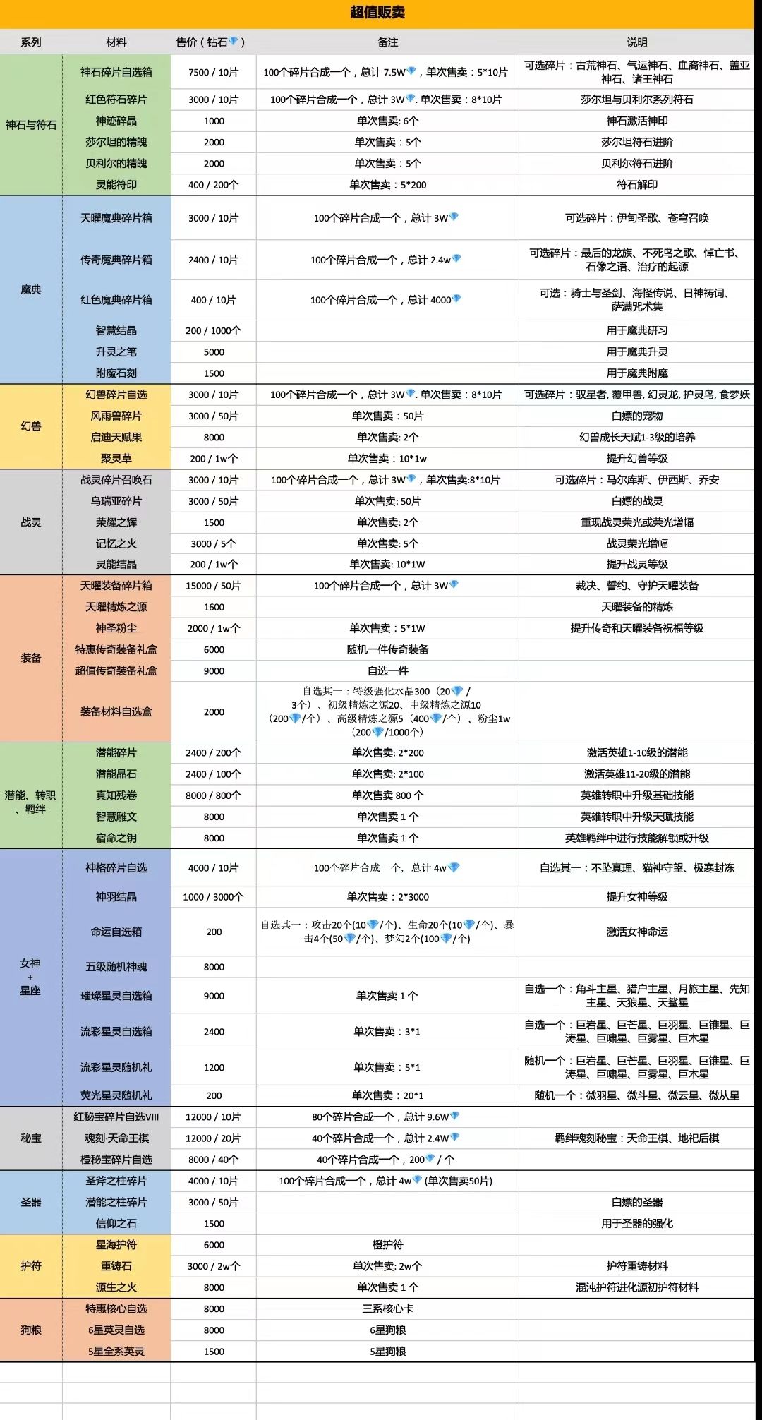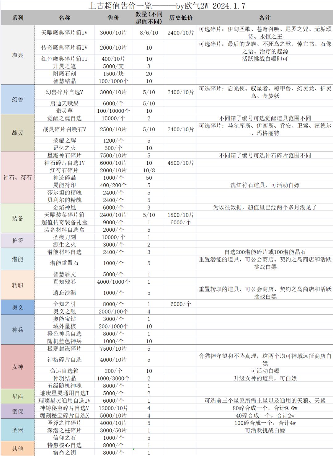 前言:参考以前大佬所做表,统计的最新超值售价一览表,参考超值为2023.11.11双十一超值至今的超值所售物品及价格。或有错误之处和未统计的,欢迎各位指正补充!!!