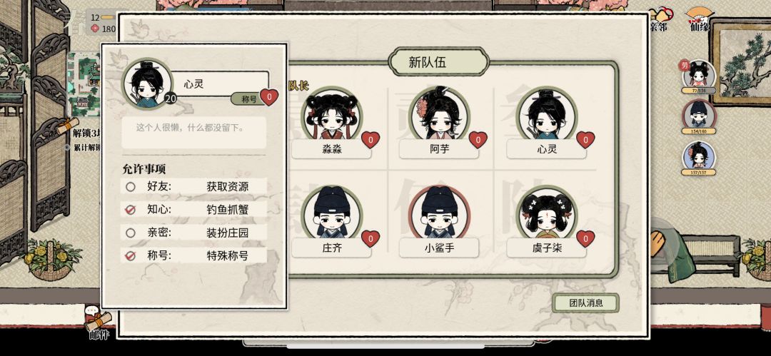 )重要更新:大家要记得点开团队里每个人的头像给队友授权一下钓鱼抓蟹(p6),不然队友去你家钓不了鱼就不能完成任务了,只能退出再重新换一家(很累