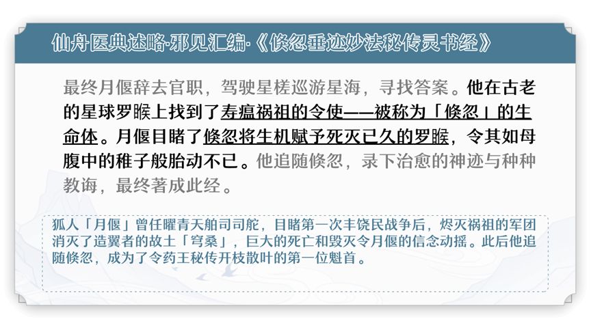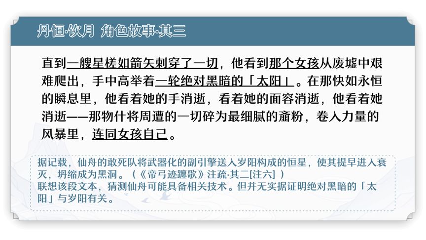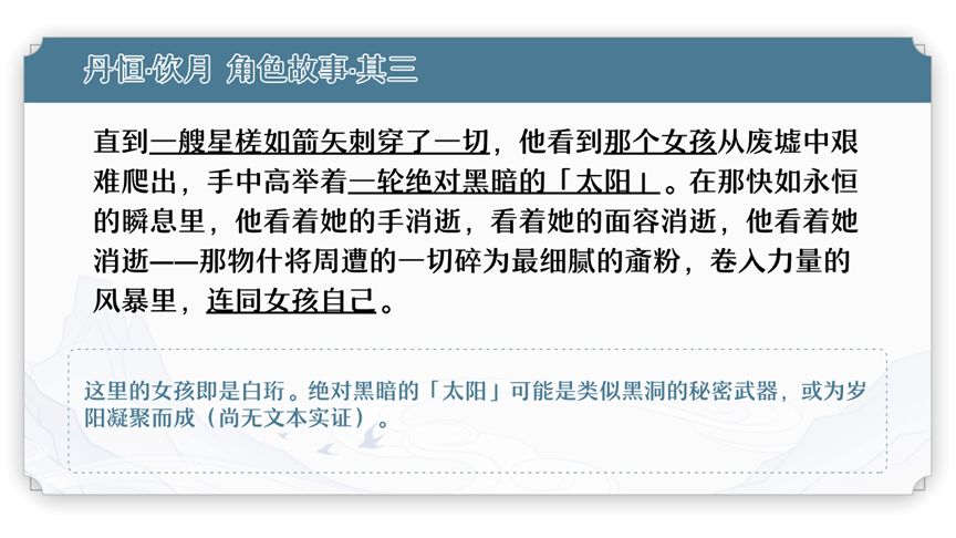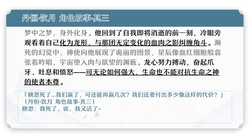 这段话的主语就是应星,变成怪物的挚爱也正是白珩。前文我们提到,白珩在倏忽之乱中,与丰饶令使「倏忽」“同归于尽”,而后又在饮月之乱中被复活为孽龙。但倏忽之乱中,丰饶联军的强大令人难以想象——丰饶令使倏忽携活体行星「计都蜃楼」围困「玉阙」,「罗浮」洞天半数被毁,云骑将士十不存一。生命终究无法战胜生命之神的使者本身。那白珩究竟是如何与丰饶令使倏忽“同归于尽”的呢?在丹恒·饮月的角色故事中我们可以找到答案:
