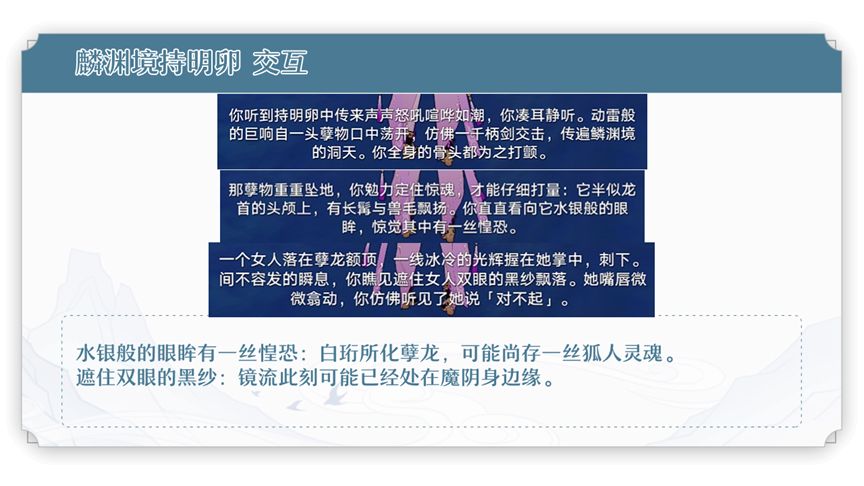 然而丹枫和应星失败了。用白珩血液和化龙妙法催化出的孽龙在麟渊境大开杀戒,无数护珠人和云骑军在动乱中死伤,无数持明卵破裂——他们再也没有机会转生。为了保证建木封印的安全,也为了终结丹枫引发的动乱,镜流含泪亲手斩杀了昔日战友所化孽龙。