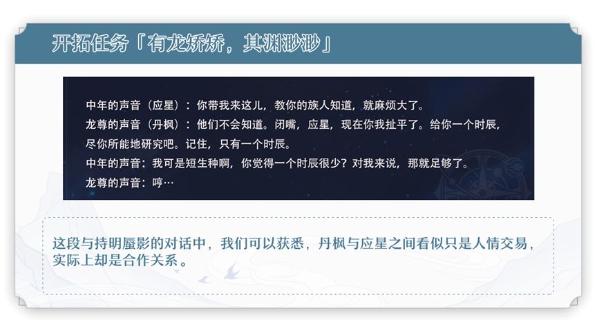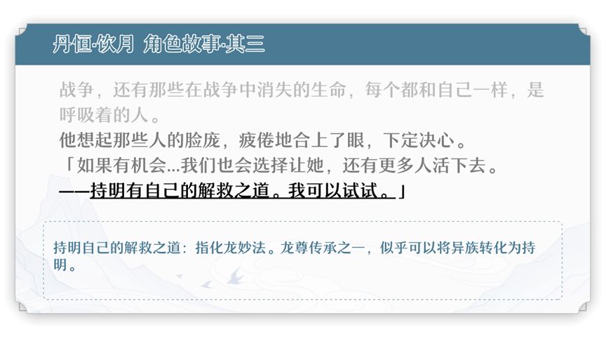 第二次丰饶战争让罗浮持明人口锐减,元气大伤。持明无法通过正常生育繁衍,有减无增,长此以往,恐有灭族之危。在各怀心思的龙师们潜移默化的引导下,丹枫注意到了持明的龙尊传承——「化龙妙法」。化龙妙法,顾名思义,就是将外族(乃至死去之人)转化为持明族的秘法。在禁止传播寿瘟(长生)的仙舟,这是一门禁术。但得知应星想要复活白珩的愿望后,丹枫内心的天平瞬间倾斜——