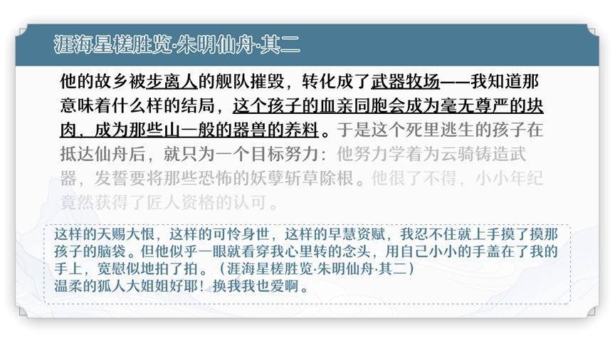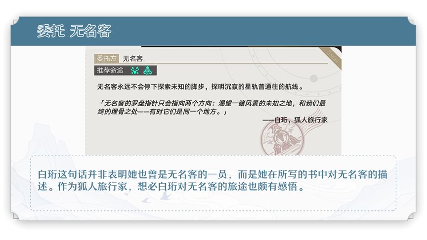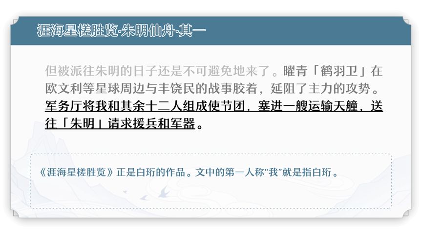 白珩在所著《涯海星槎胜览·朱明仙舟》一文中记载了此事,但后续如何我们不得而知。有开拓者曾经猜想,或许正是白珩开口,向怀炎索要了他的宝贝徒弟应星,驰援曜青仙舟,才使得应星出人头地,在后续的战事中大放异彩,功勋不断。或许,应星也因此对白珩怀有爱慕之情。在隧洞遗器「云无留迹的过客」故事中我们可以看到这样一段话: