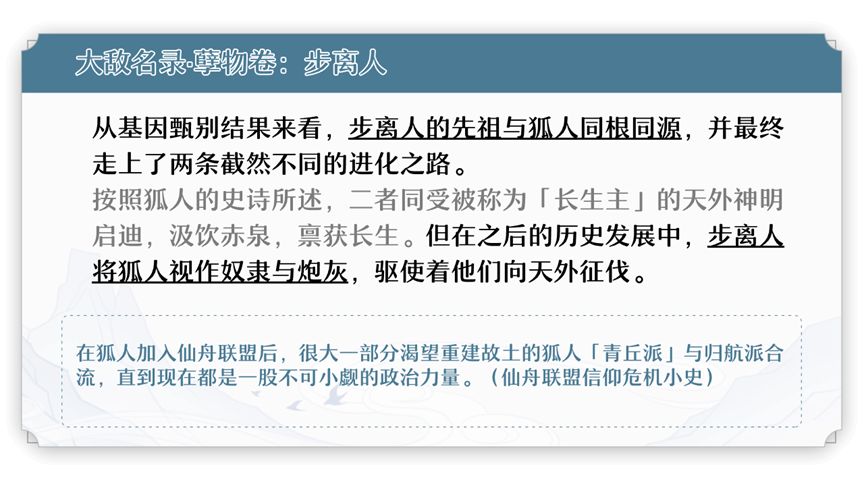 狐人和步离人源于同一个星球,丰饶星神赐福后,狐人曾被步离人奴役,后来被仙舟联盟解救,并加入仙舟,成为仙舟诸民的一份子。