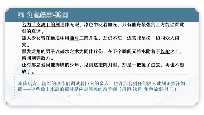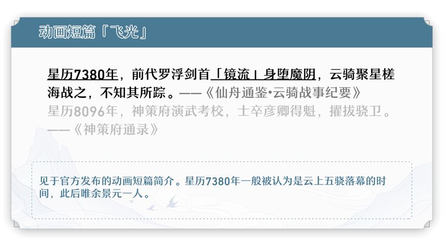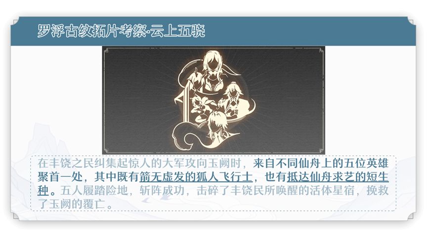 从阅读物「罗浮古纹拓片考察」中,我们也可以探究到云上五骁剩余两人,也就是画面中其余二人的身份:箭无虚发的狐人飞行士——白珩抵达仙舟求艺的短生种——应星
