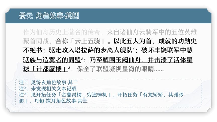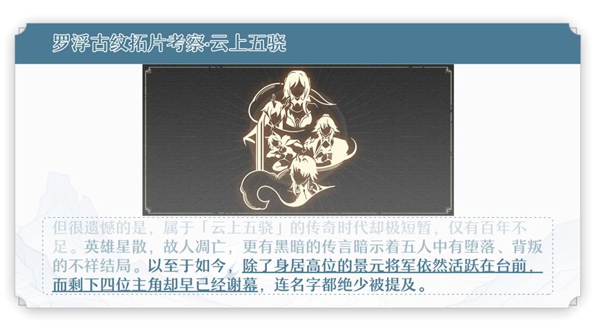 这期我们就带大家盘点一下当前版本中已经出现过的,关于「云上五骁」的蛛丝马迹,也算是为这五位角色做一个考据大合集。