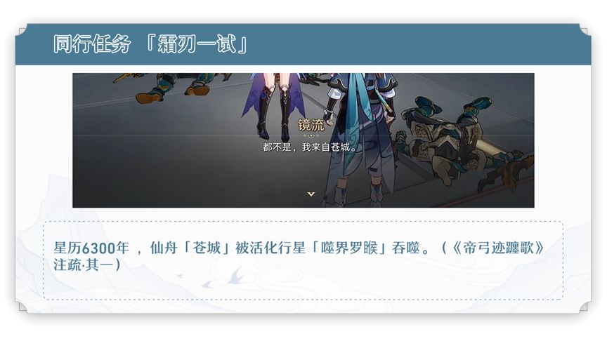 这里第一个提到的功勋,「驱走攻入塔拉萨的步离人舰队」,其实在符玄的角色故事中亦有体现。塔拉萨是一个海洋星球,仙舟「岱舆」坠毁于此,启蒙了伊须磨洲文明;