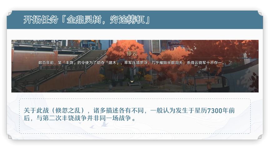 星历7300年前后,丰饶令使「倏忽」为了劫夺「建木」,携活体星球「计都蜃楼」围困「玉阙」,压境「罗浮」。