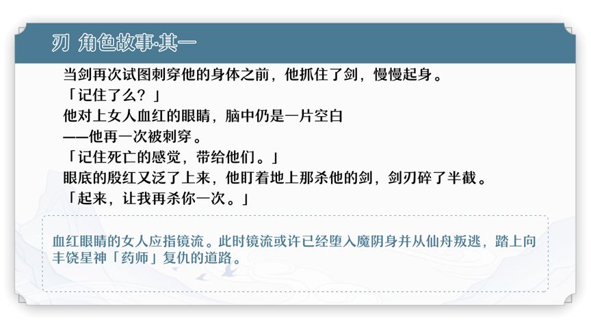 不知何故,镜流把支离剑留给了他,再一次不知所踪。新生的他将自己命名为「刃」,踏上了他自以为复仇的路。后来,他遇见了星核猎手卡芙卡和萨姆。
