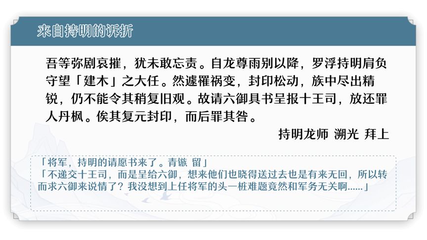 罗浮仙舟接连遭受倏忽之乱和饮月之乱,也不得不暂停对丰饶孽物的追猎,与其他文明展开贸易,休养生息。持明族呢?连一刻也没有为逝去的族人哀悼,立刻开始了争权夺利的是——持明龙师。龙师会议残碑记载,有龙师试图以龙师会议取代龙尊主政;也有龙师不断向将军景元和仙舟六御递交诉折,试图为丹枫减轻罪罚,乃至放还丹枫。