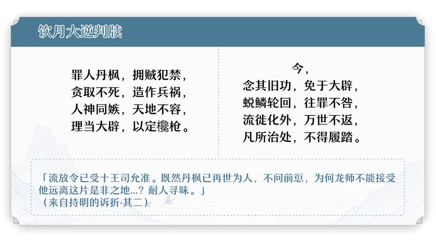 判椟一出,龙师哗然。持明蜕鳞转生之后,将失去所有记忆。按理来说,转生的丹枫将不再是丹枫,而是一名新持明。龙师们指望转生的丹枫重回他们的掌控,重新培养这位持明龙尊,以谋取权势。为此他们甚至刻意未给丹枫完整蜕鳞,导致转生后的丹枫仍隐藏着部分龙尊之力。这也使得新饮月君「白露」的龙尊传承并不完整,龙师们可谓自食其果,不过这是后话了。但景元不愿转生后的丹枫再次陷入泥淖,成为政治博弈的牺牲品;也有意整治龙师中蔓延的持明分离主义倾向,弥合仙舟与持明族的伤痕。于是他将丹枫流徙化外,万世不返,希望他远离罗浮,重新做人。