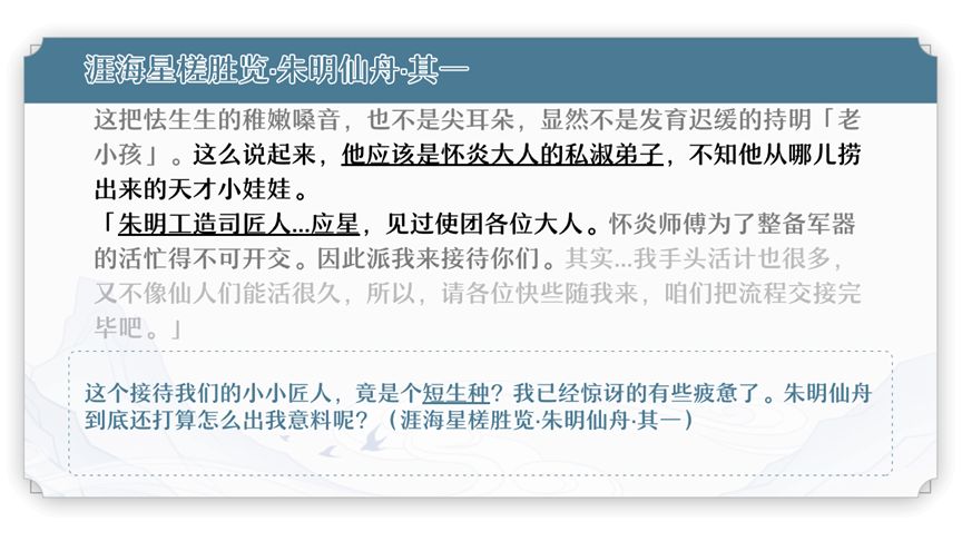 在朱明仙舟,她见到了在此拜师学艺的短生种,未来的云上五骁之一,「应星」。这是云上五骁中的二人第一次碰面。当时的应星还只是个半大孩子,但已经是朱明将军,铸炼宫的主人,仙舟最长寿之人,工匠中的工匠——怀炎——的徒弟。