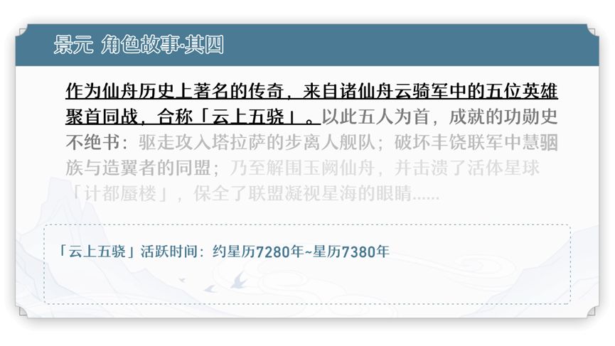 在景元的角色故事中,有着这样一段介绍。「诸仙舟云骑军中的五位英雄」,我们可以这么理解云上五骁的含义。那么这五位英雄都是谁呢?在动画短片「玄黄」中,丹恒站在龙尊雨别雕像前,恍惚中仿佛见到了「云上五骁」曾经于此聚会时一同举杯的情景。