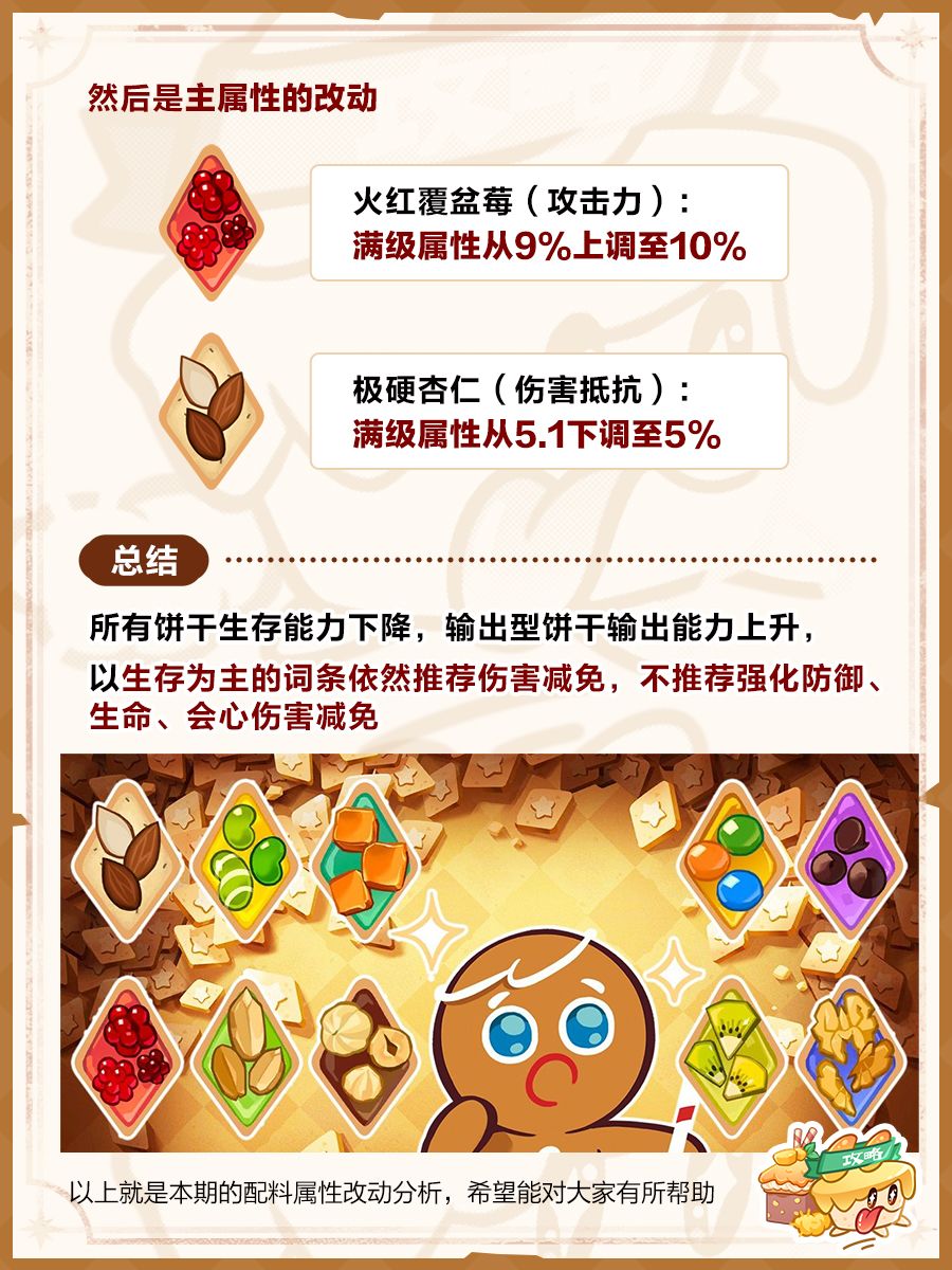 公测后的配料改动与分析,数据和二测有出入。目前主推配料还是以杏仁(伤害减免)、覆盆莓(攻击)和巧克力豆(冷却)为主,副属性优先选择伤害减免>冷却和攻击。