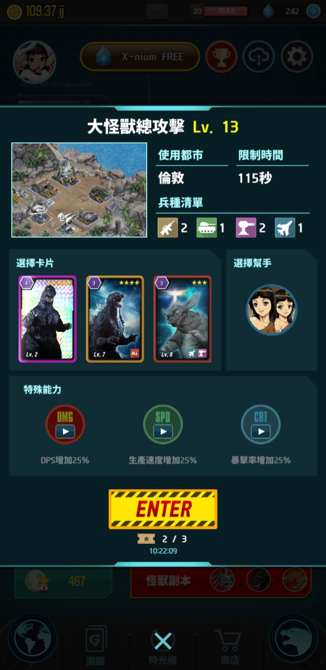 另外,攻略卡片个人建设用双攻击力up和五星哥斯拉(根据当前都市dps的倍数伤害,双功击力up剩7秒以上配合使用效果更佳)