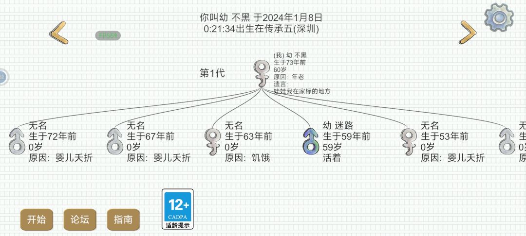 下一世,我返回去看族谱,我的幼迷路还活着!但是家标这里没看见他人,于是我向下走了很远(没发现),与此同时我又迎来了新生命,一个女娃娃,我唤她归途希望我能回家。我跟她又说了一遍我的情况,她愿意留下陪我一起找家,鬼使神差下,我跟她说带他去看看尸体那个地方,后面找到差不多(我也不认得了)我说看有蛋,可能有人经过这里,就是这附近了,我俩利用口哨扩大寻找范围,无果。娃娃祝我找到,我也带着她的希望继续寻找。不知明力量驱使,我选择向右走,可能路上有遗迹?我终于看到了我家的兔子!