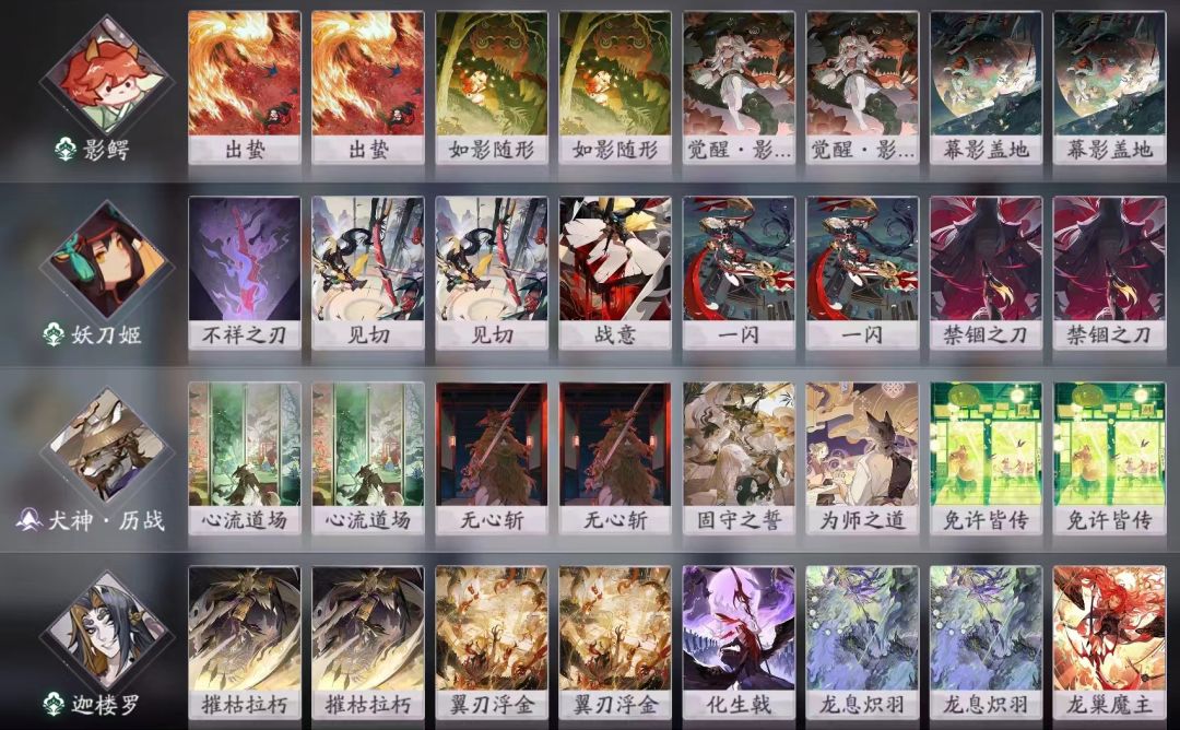3、犬神,既然标题是幻境,所以犬神心流道场满编,对应的,由于心流道场提供的攻击力跟犬神等级有关,而且影鳄觉醒也算加攻点,所以妖刀推荐满编1勾卡。