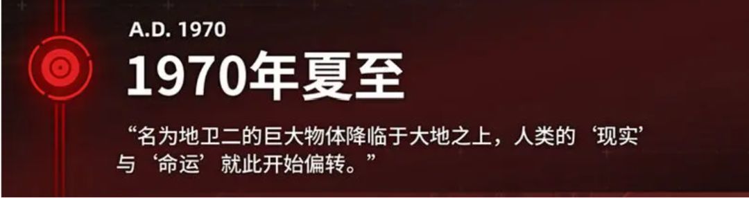 若要对时间线进行整理,首先需要确定一个可供前后追溯的“元年”。根据官方发布于2021年12月14日(修改于2022年12月5日)的名为《世界观|世界观整体披露》当中,我们可以得知,临界——即“地卫二”进入地球轨道——发生于1970年夏至,这也是游戏历史与现实发生偏移的起点,因此将其作为元年进行推导的基础。