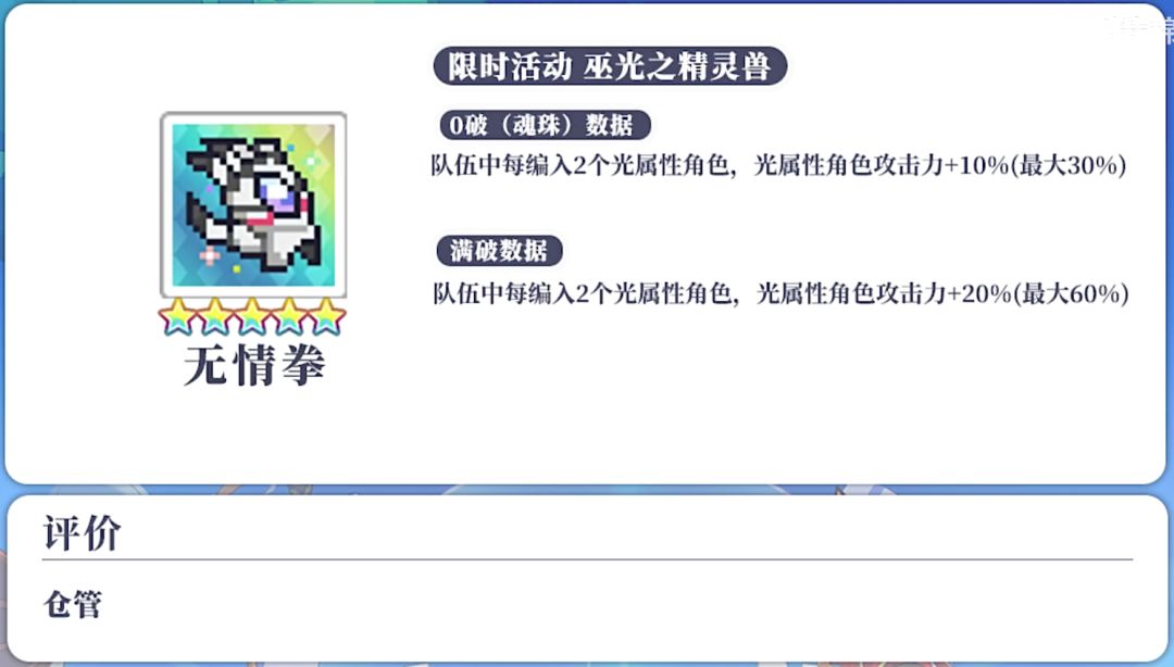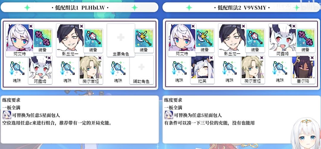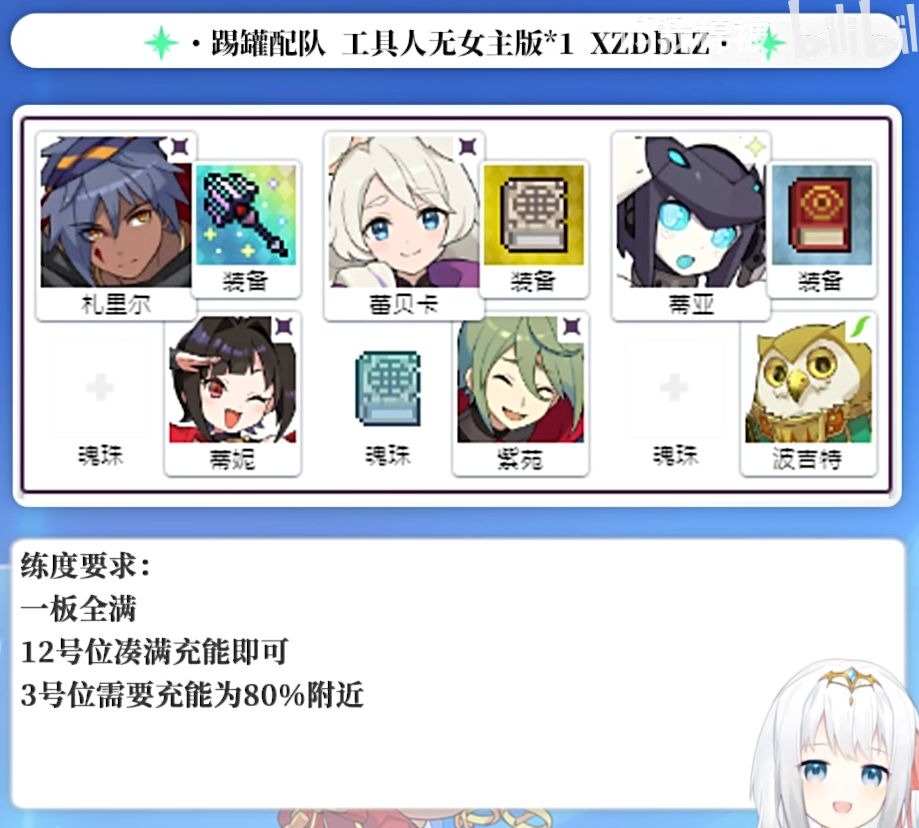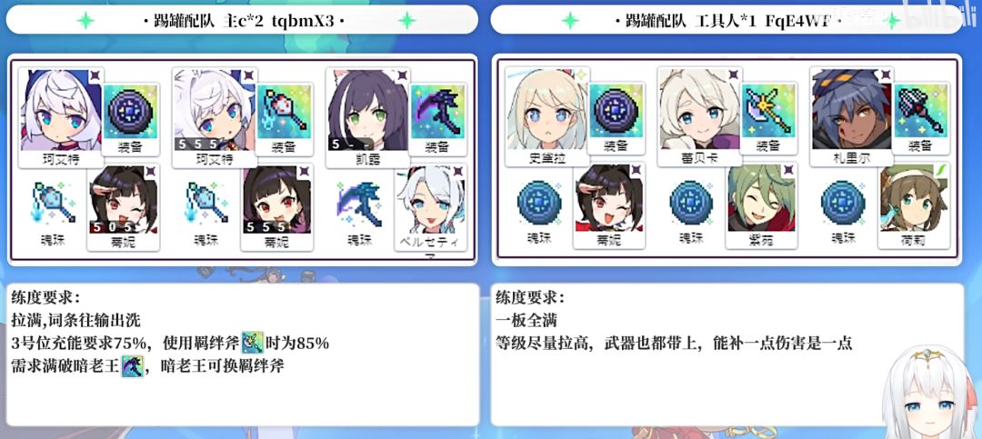 由于本次boss血量很厚所以伤害非常极限,因此推荐工具人武器带满尽可能增加输出,没有暗老王的主c盘可以考虑羁绊斧,但是由于没有了暗老王的充能加速需要注意三号位充能;工具人方面如果没有女主可以用下面的工具人队伍,但是需要注意如果使用该配队的话需要主c三号位充能为75%。