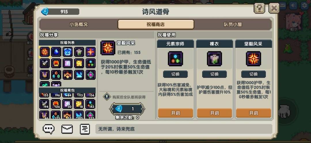 因为风柱子攻击频率很高,是有暴毙风险的,所以可以考虑带一个坚毅风采。