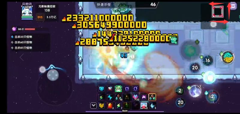 1.开局不要动,原地点4个技能和疾跑,紫技能雷针需要自己先打几次找找感觉,看几针能杀死右下角的部分怪物;