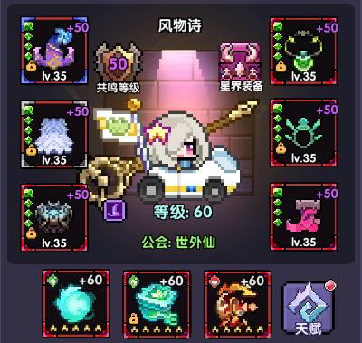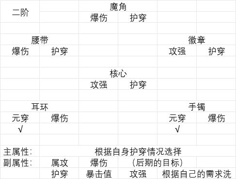 如果极度缺乏元穿,魔角和核心可换成一阶的外装,主属性元穿