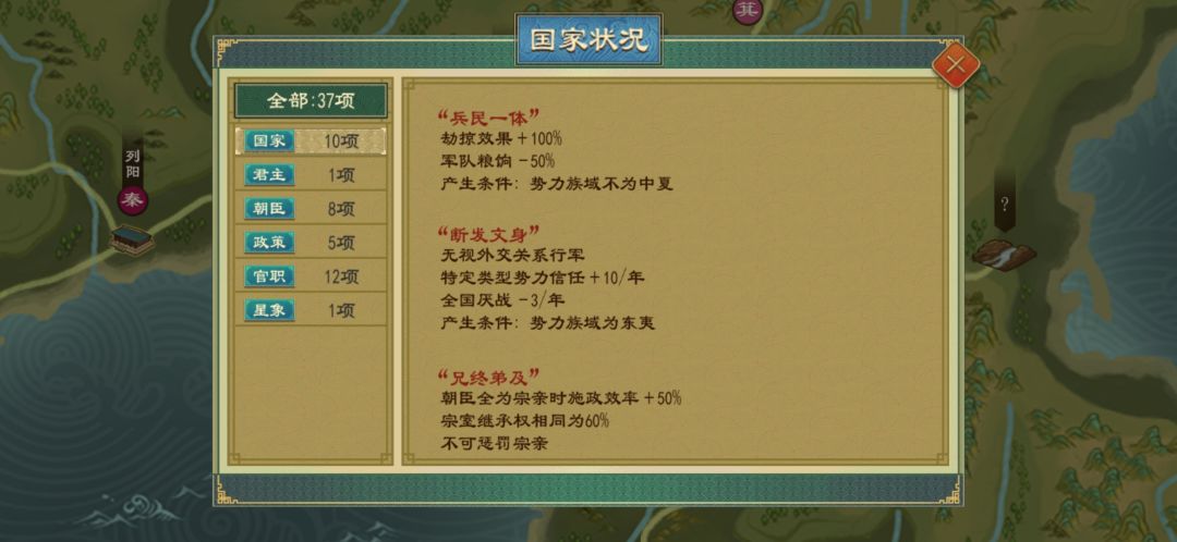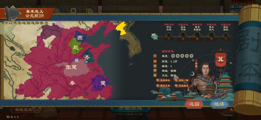 先来介绍一下箕国,箕国是秦汉唯一一个东夷族域的国家,众所周知啊,东夷buff断发纹身可以让我们无视外交行军,平时可能没那么大的作用,借道就完事了,但是秦汉地图有荒地,而断发纹身可以在荒地上驻军和走动,这点恰好就是本篇思路,利用无视外交行军探索西域