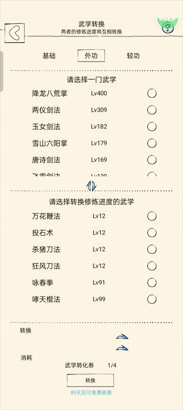 基础,外功,轻功的转换冷却是独立的,不互通的。也就是转换完轻功可以立即转换外功(冷却好了的情况下)