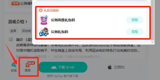 弈士们可以在tap详情页的最下方,点击活动图标并将弹窗拉至最底下,即可获得【公测高级礼包码】和【公测礼包码】;